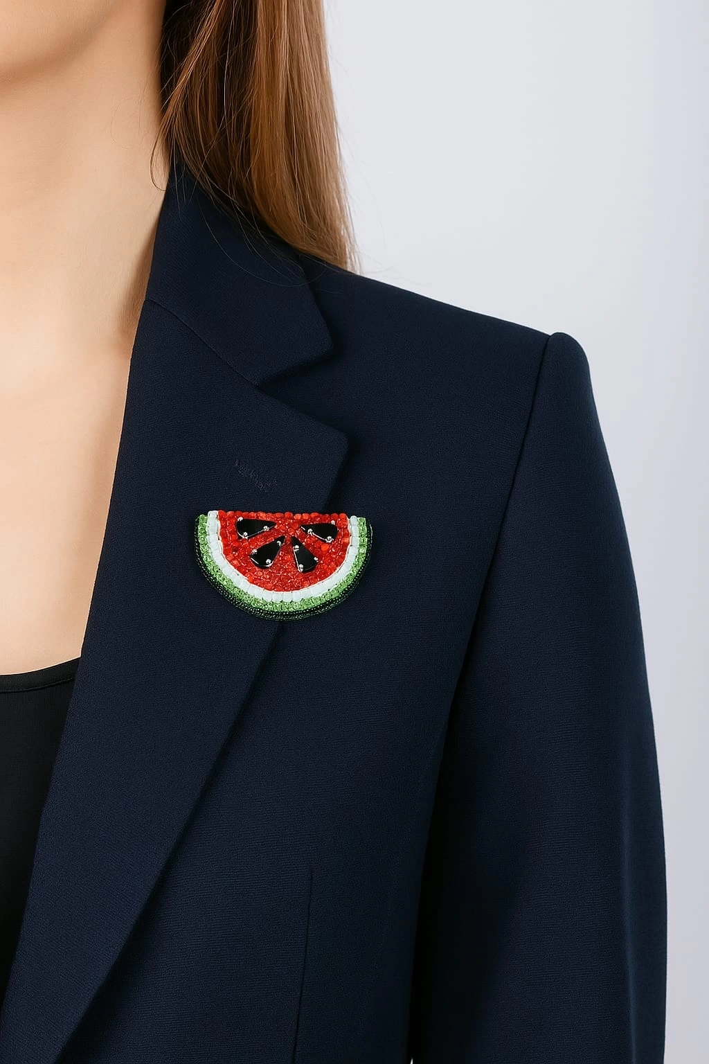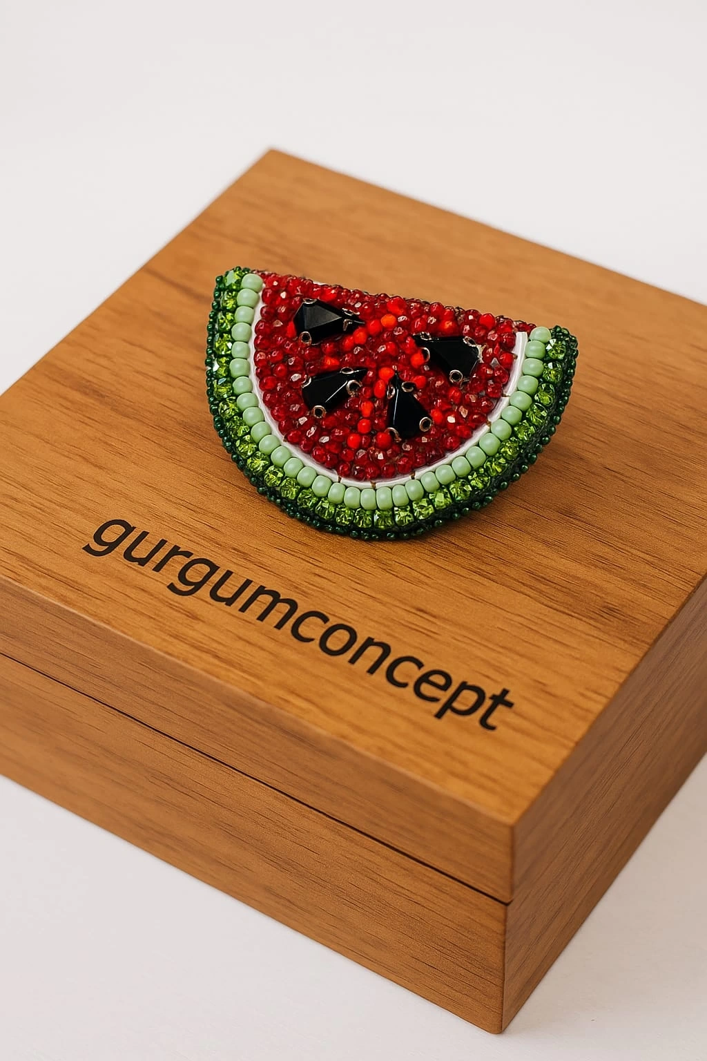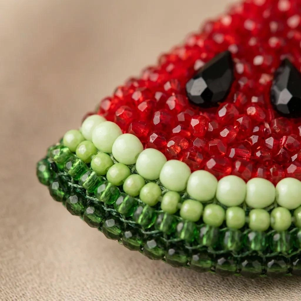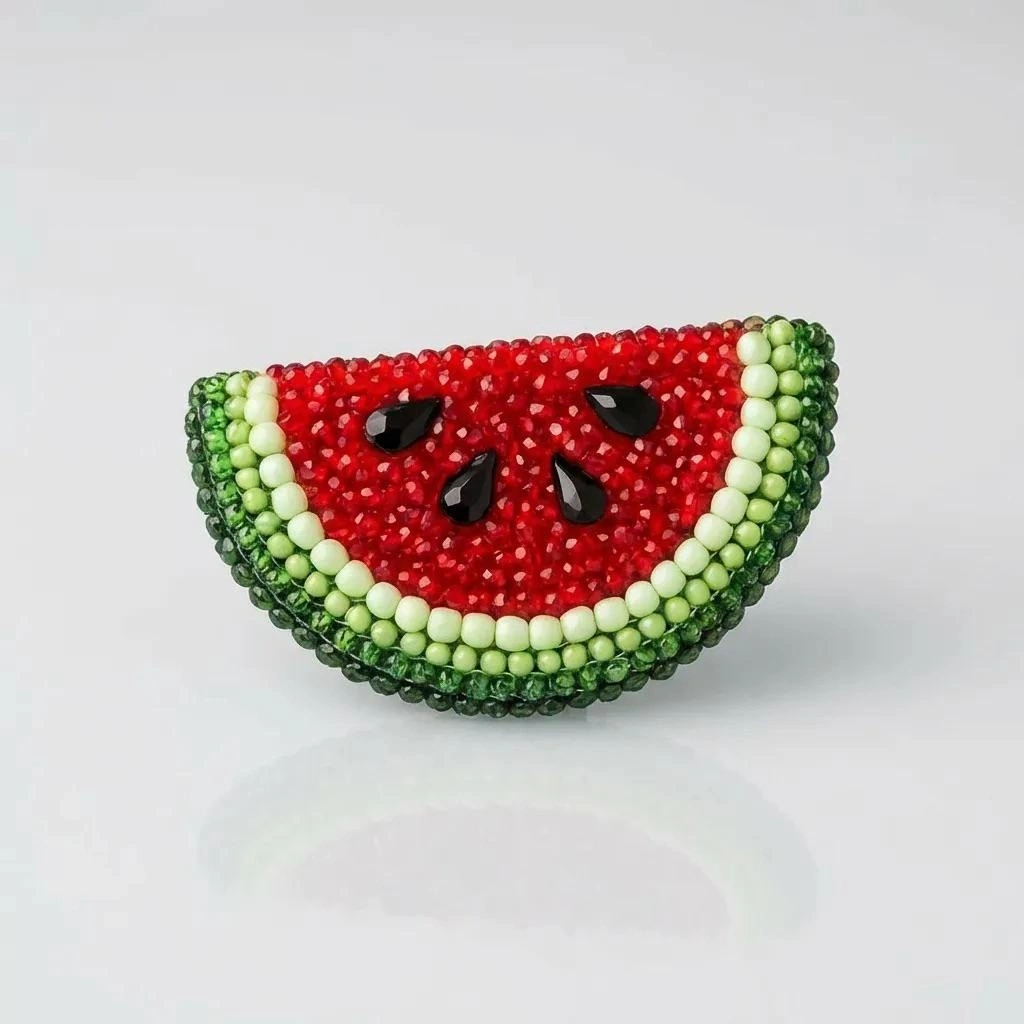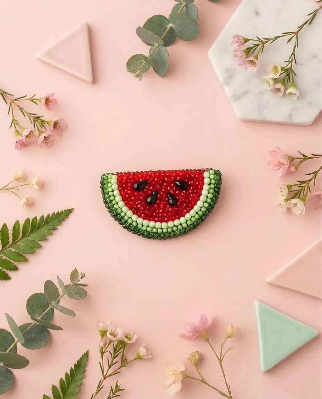 Ürün Özellikleri : Kristal,boru ve kum boncuklarla üç boyutlu bir doku verilmiş; sert kurtcuklar ile karpuzun karakteristik formu zarif bir şekilde vurgulanmıştır.