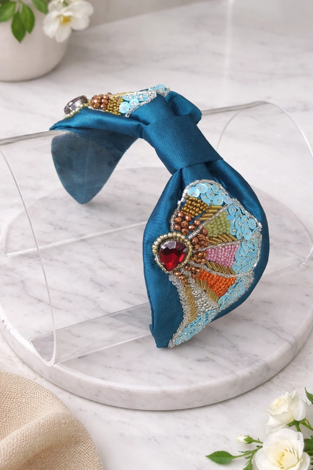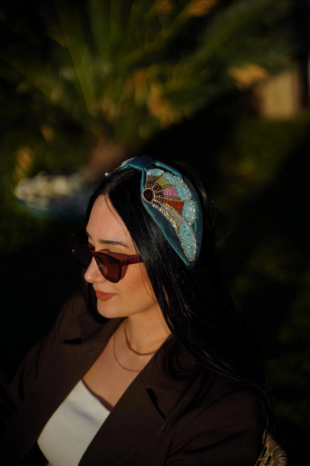 Ürün Özellikleri : Mavi kumaş üzerine, desen boru boncuk, pul boncuk, kum boncuk ve kristal boncuklarla işlenmiştir.