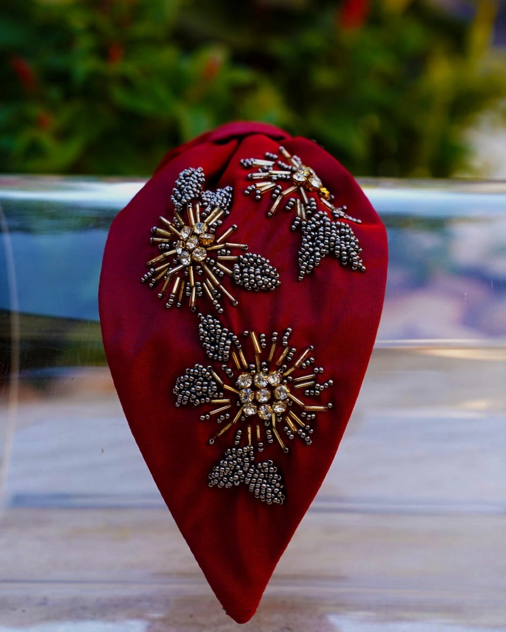 Ürün Özellikleri : Bordo kumaş üzerine, desen boru, kesme ve kristal boncuklarla işlenmiştir.