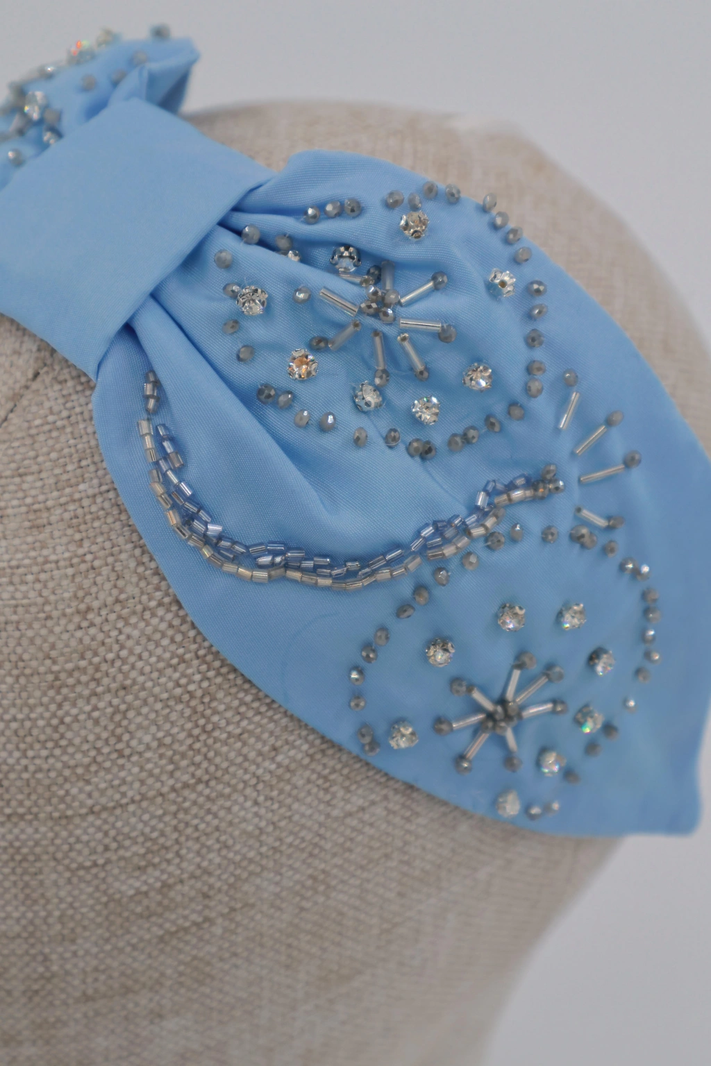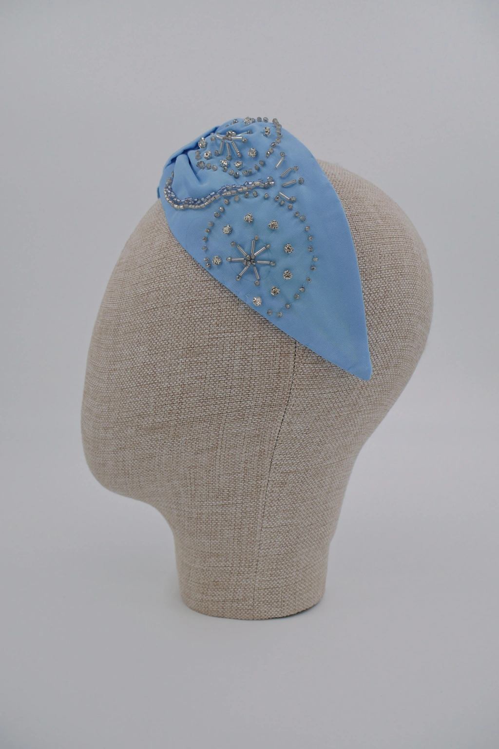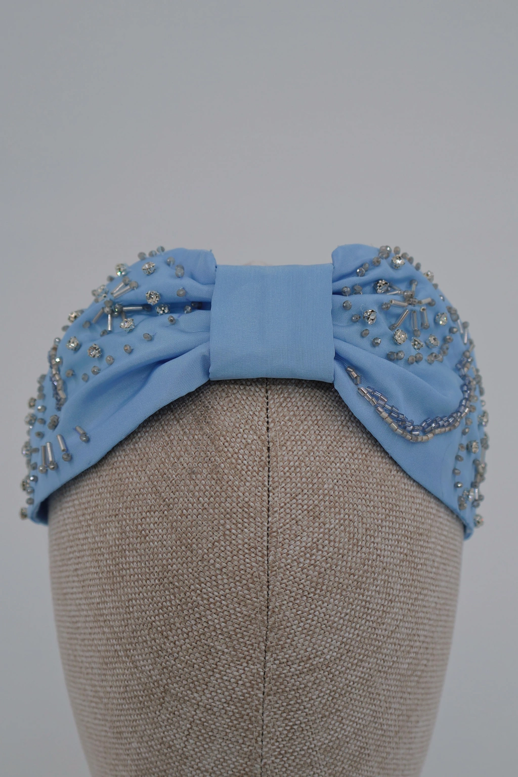 Ürün Özellikleri : Mavi kumaş zemin üzerine, geometrik desen özenle kristal, boru ve kum boncuklar ve ışıltılı pullarla tasarlanmıştır.