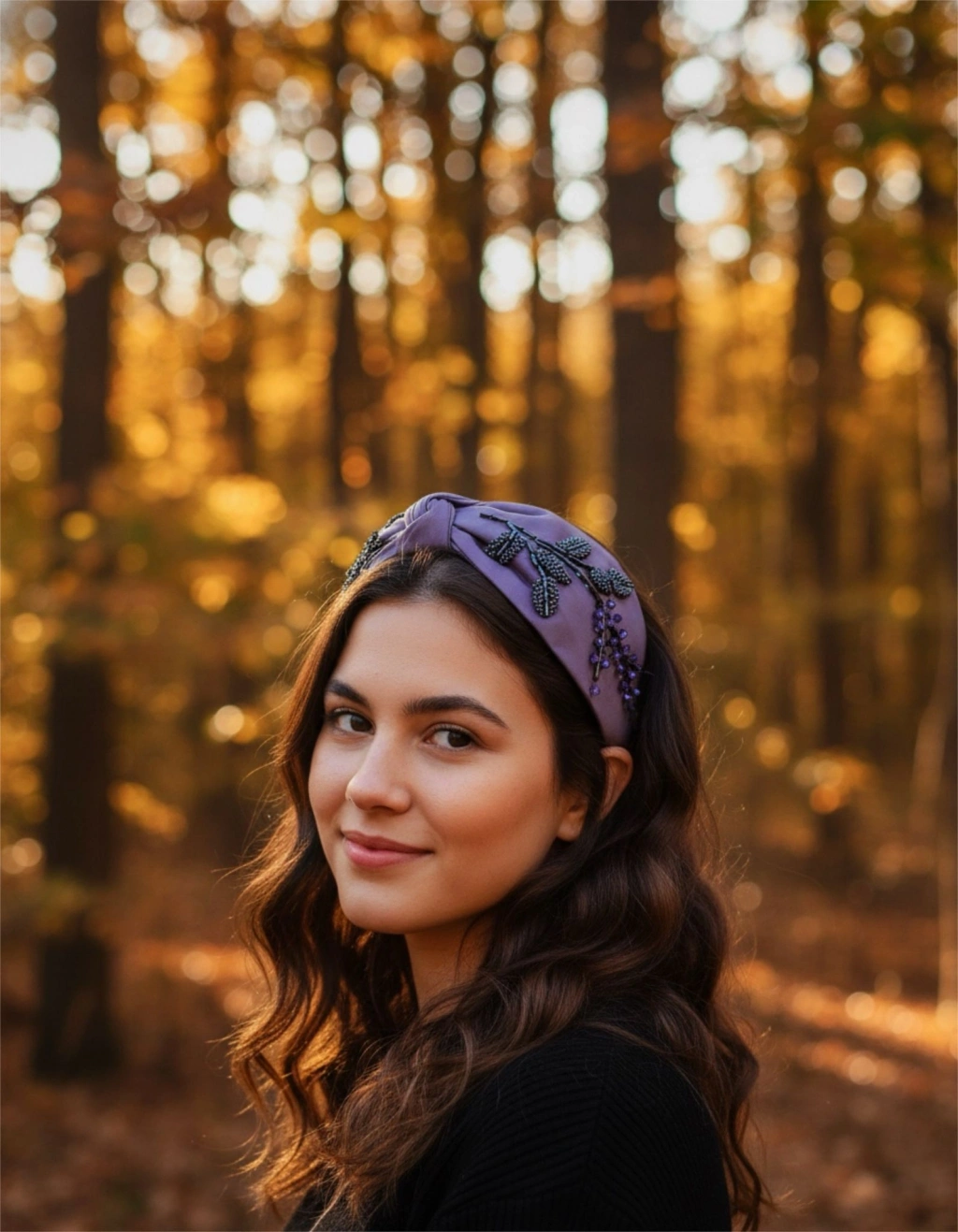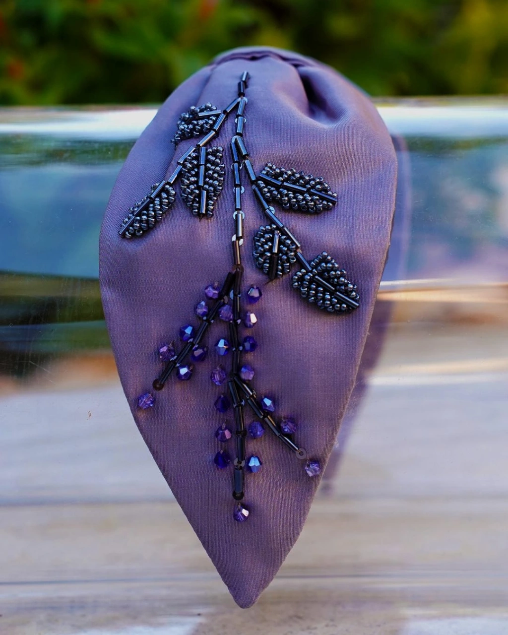 Ürün Özellikleri : Mor kumaş zemin üzerine, desen boru boncuk, kum boncuk, pul ve kristal boncuklarla işlenmiştir.